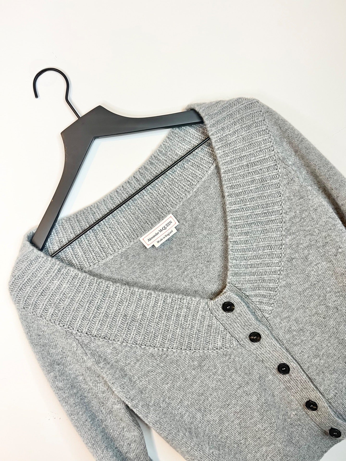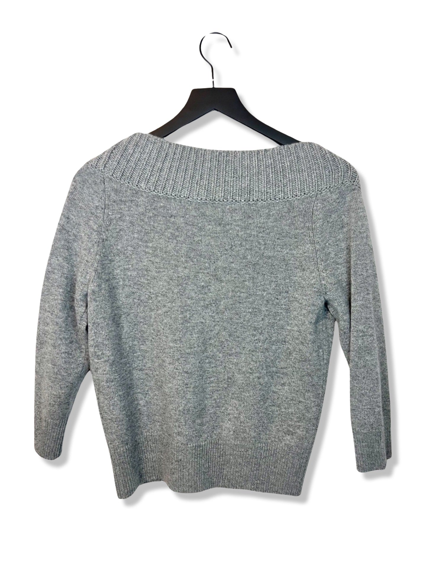 - Gray 100% cashmere sweater with black buttons