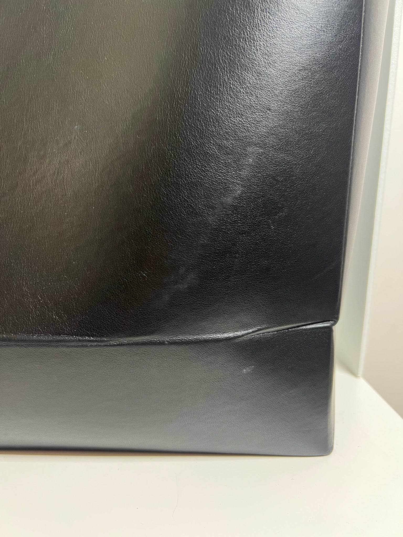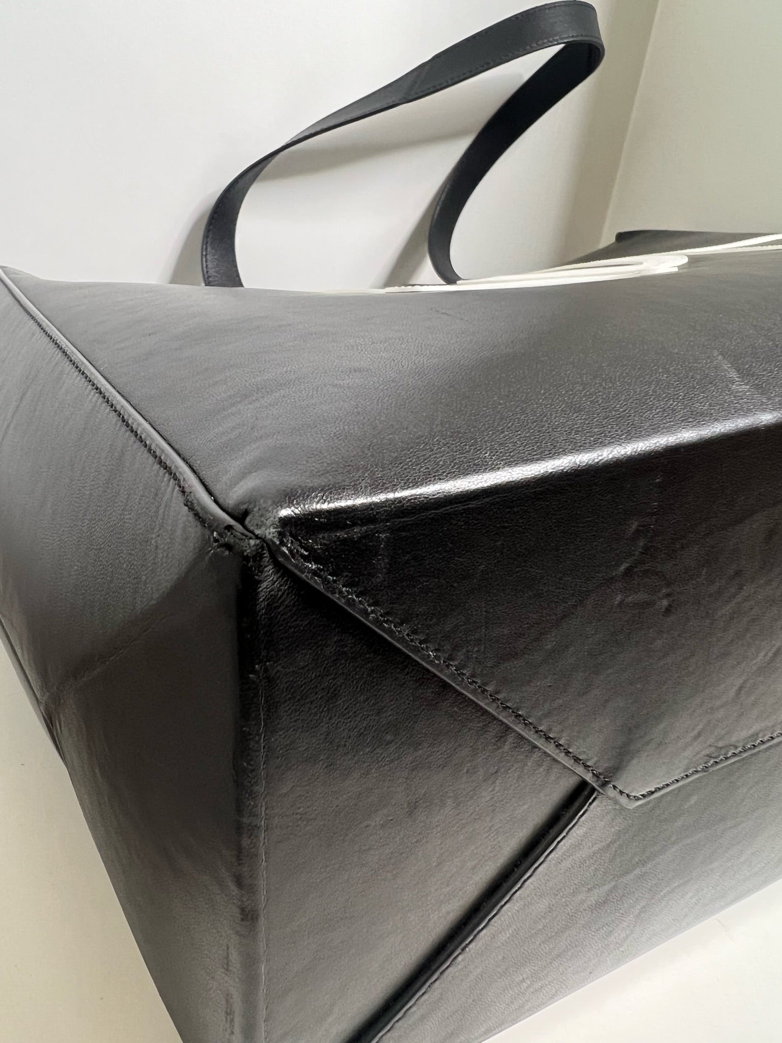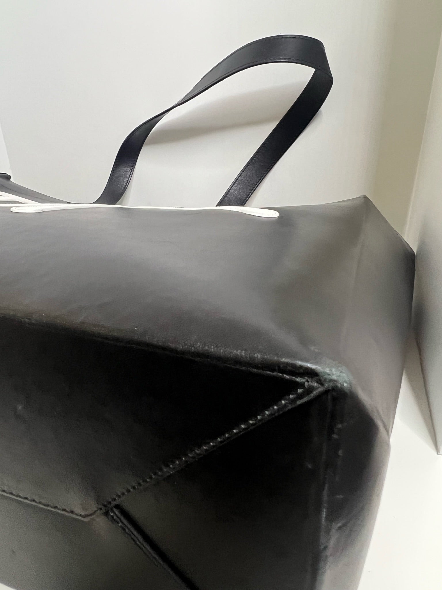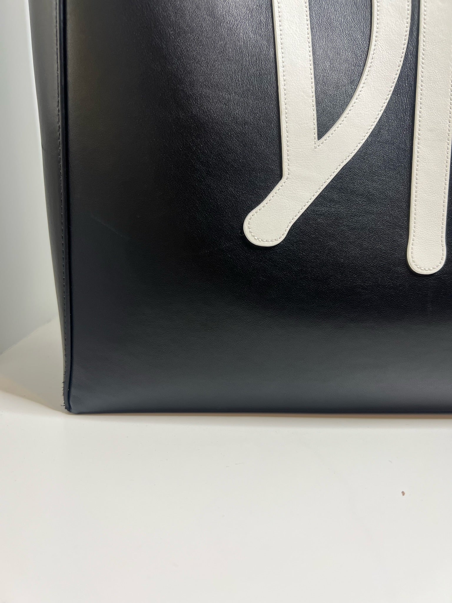 - Smooth black leather with a white appliquéd with a graffiti-inspired logo