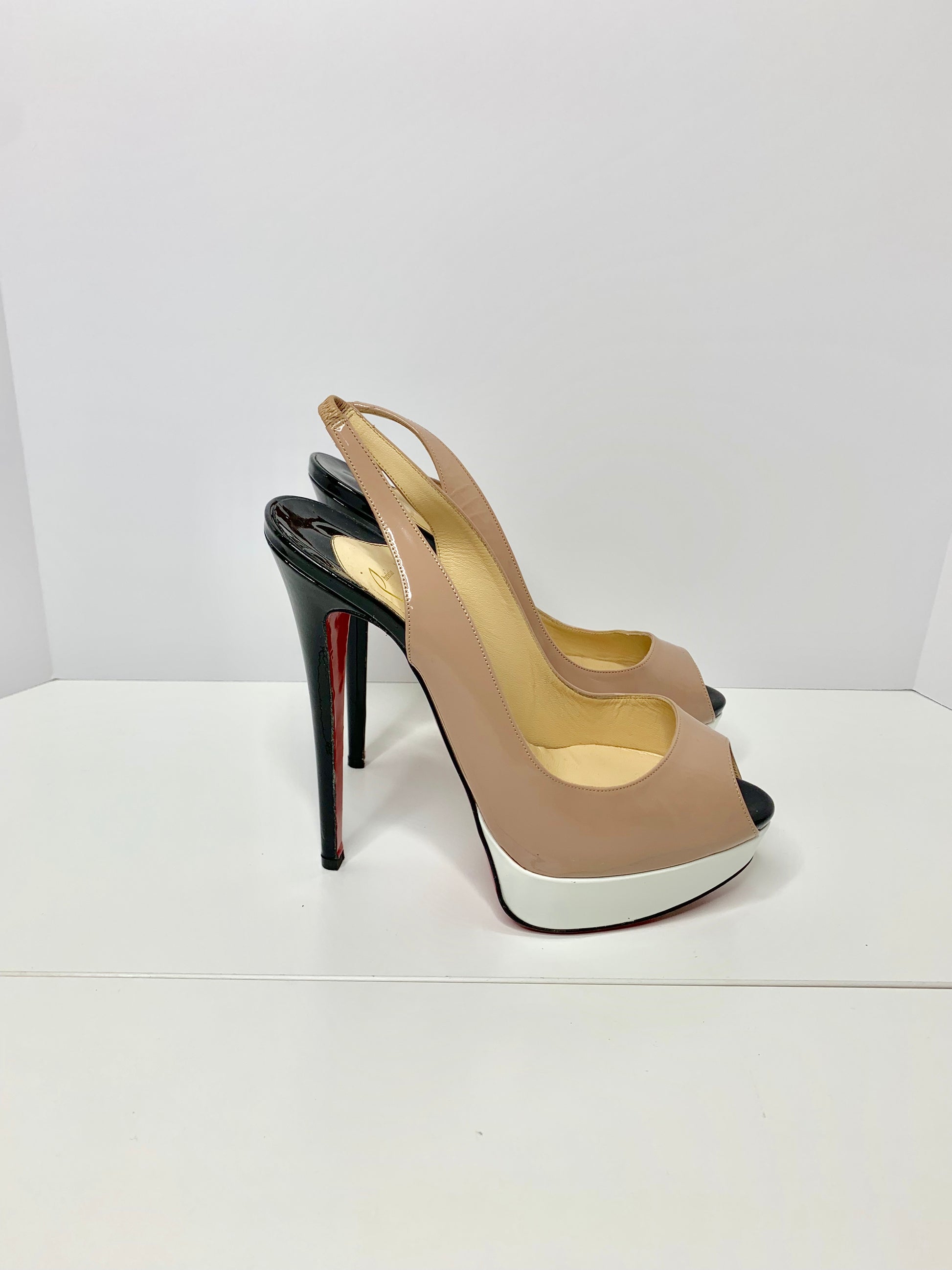 Nude, black and creme leather Christian Louboutin slingback Lady peep-toe pumps with tonal stitching throughout and covered heels.