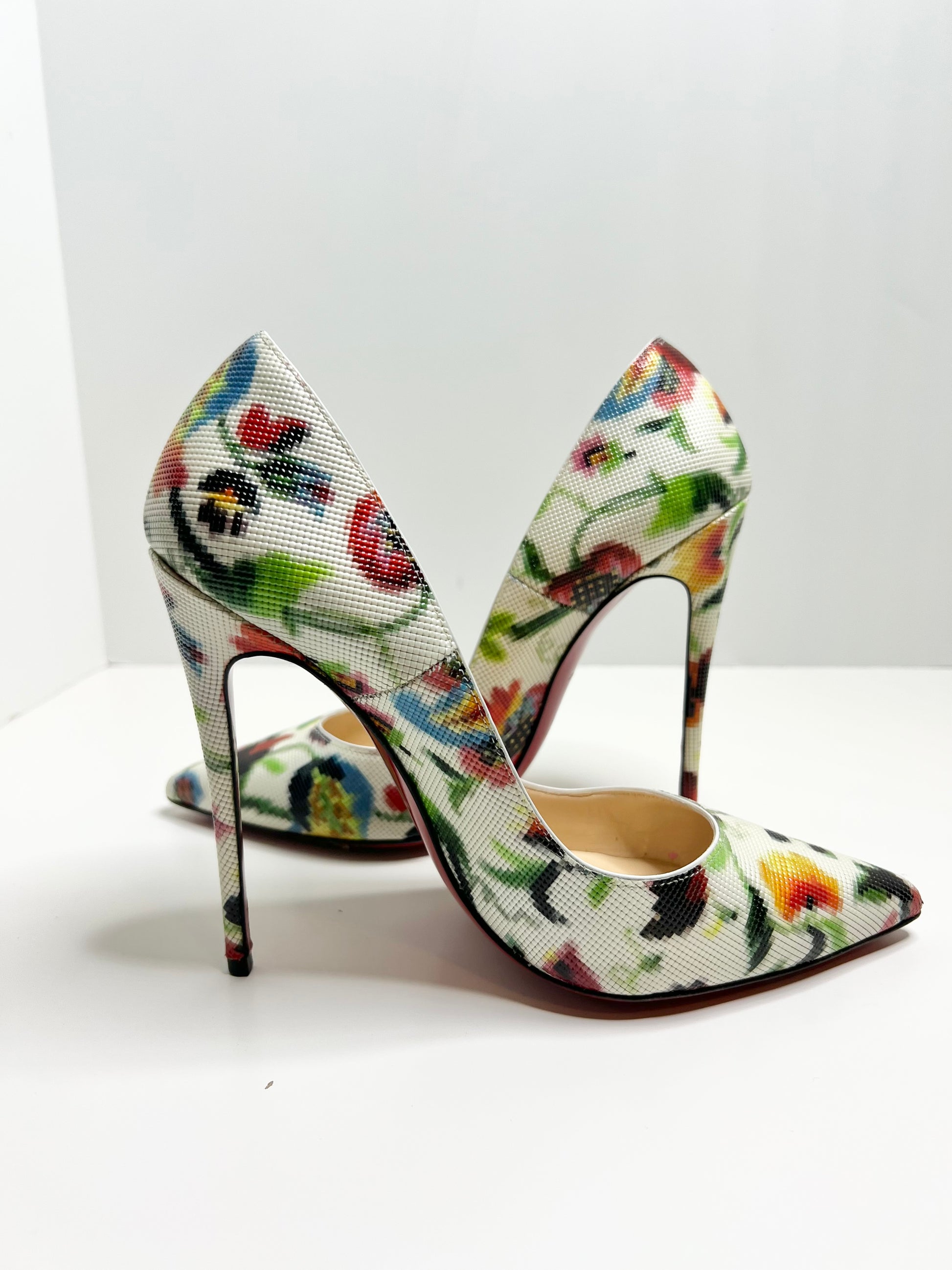 - Pointy leather pump with mosaic floral print