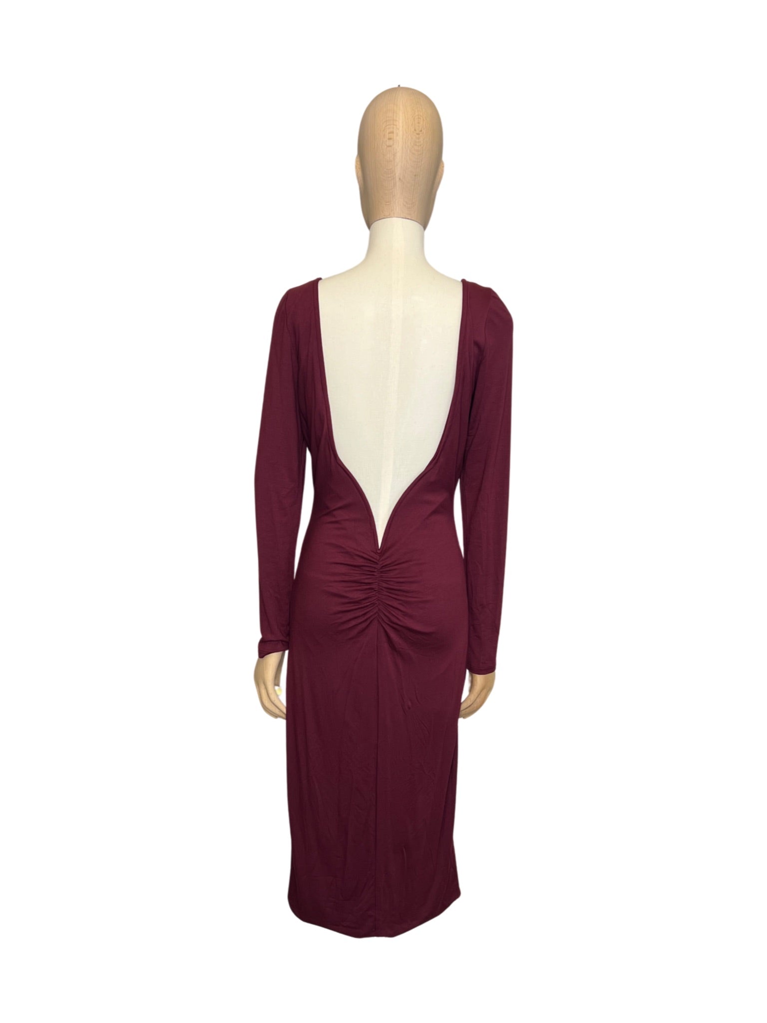 - Deep low-cut back with ruching