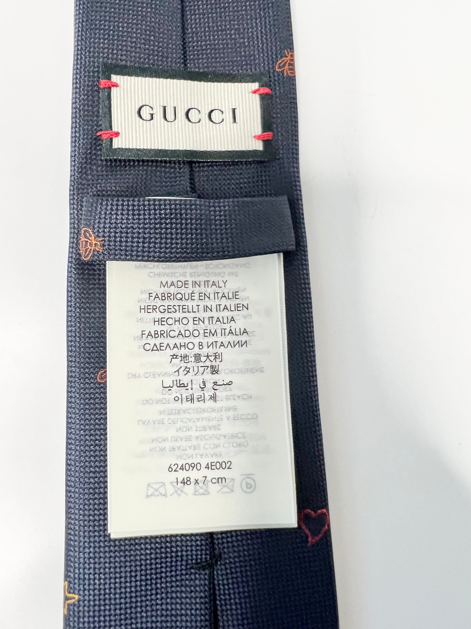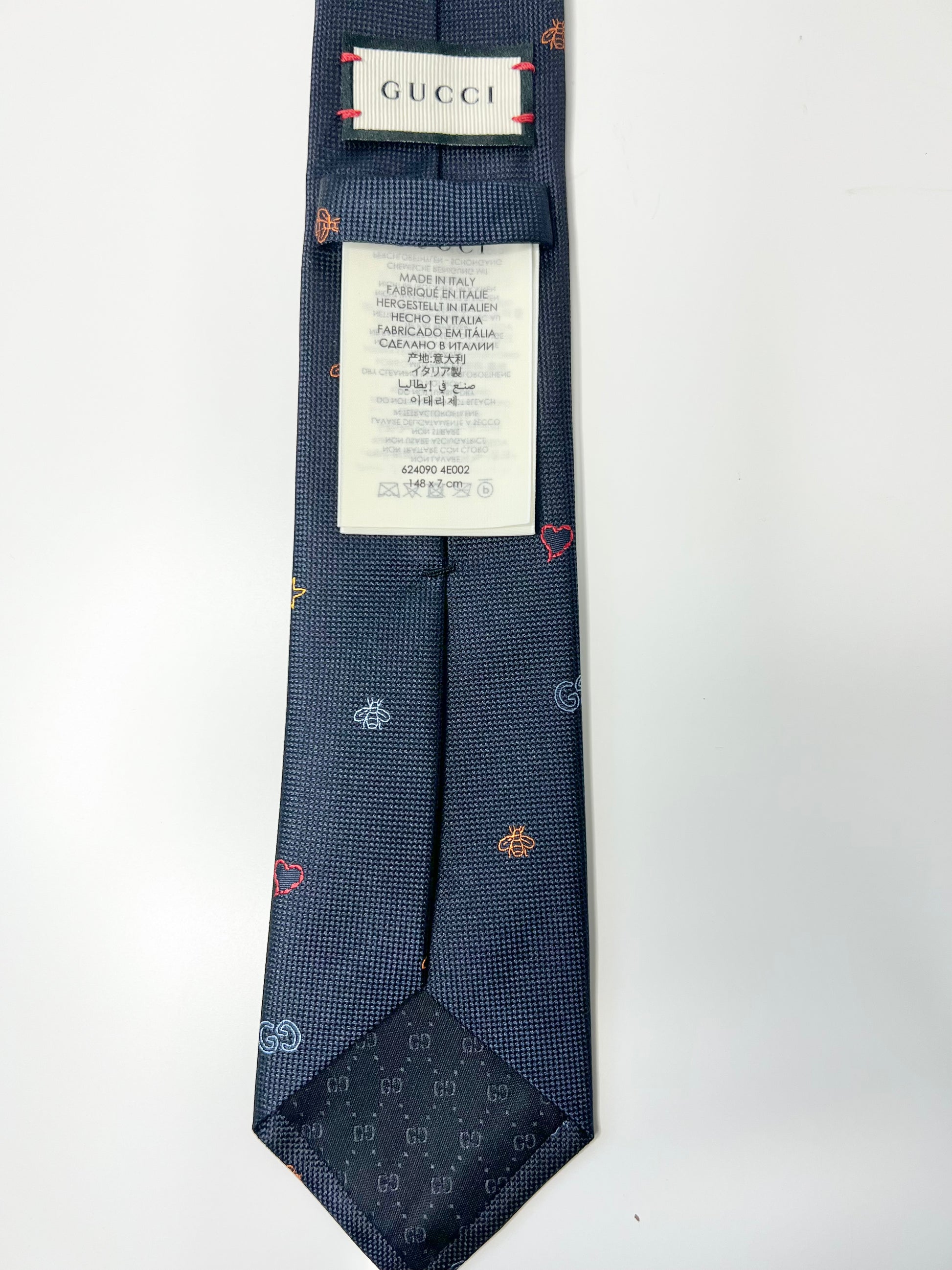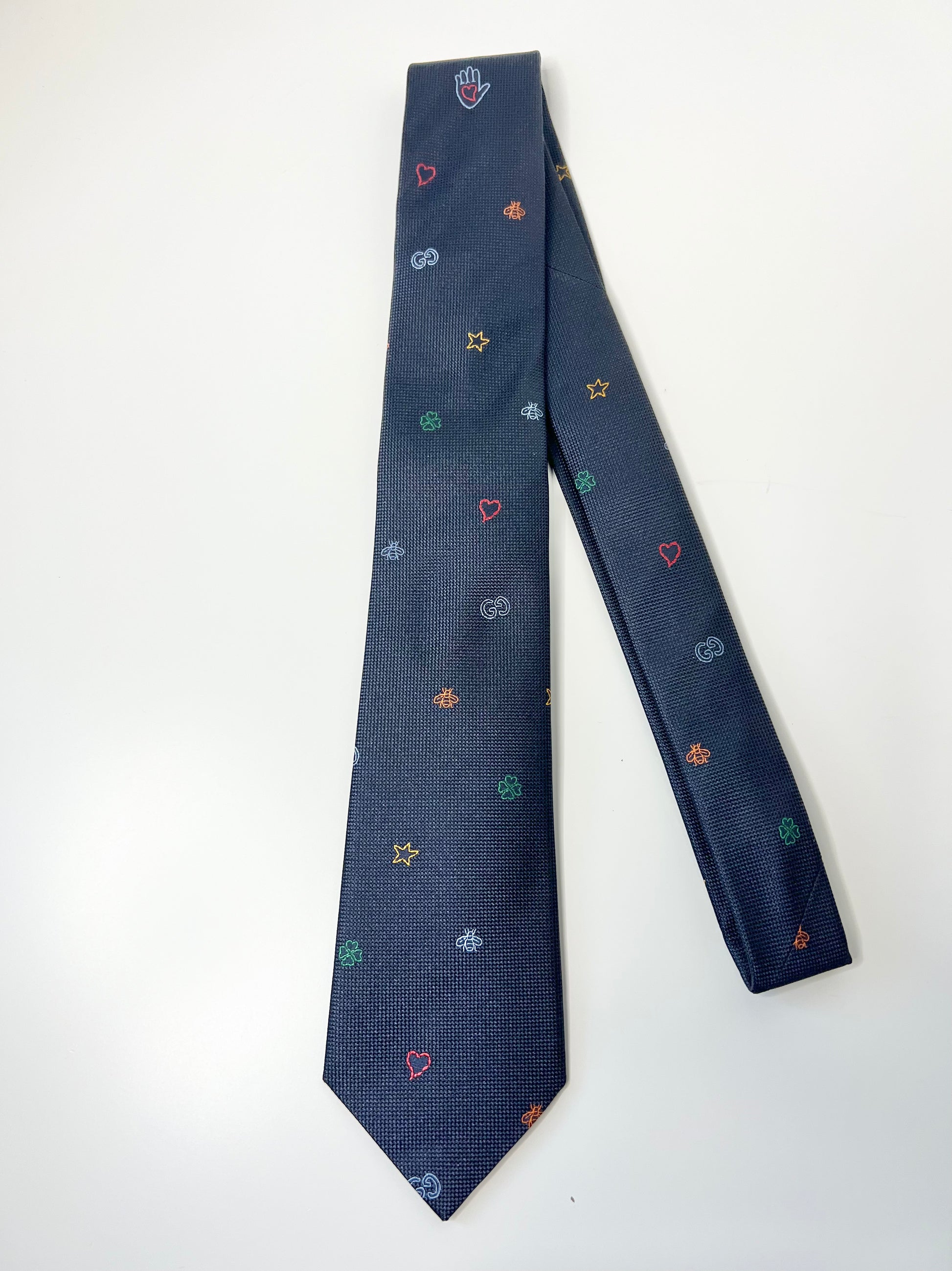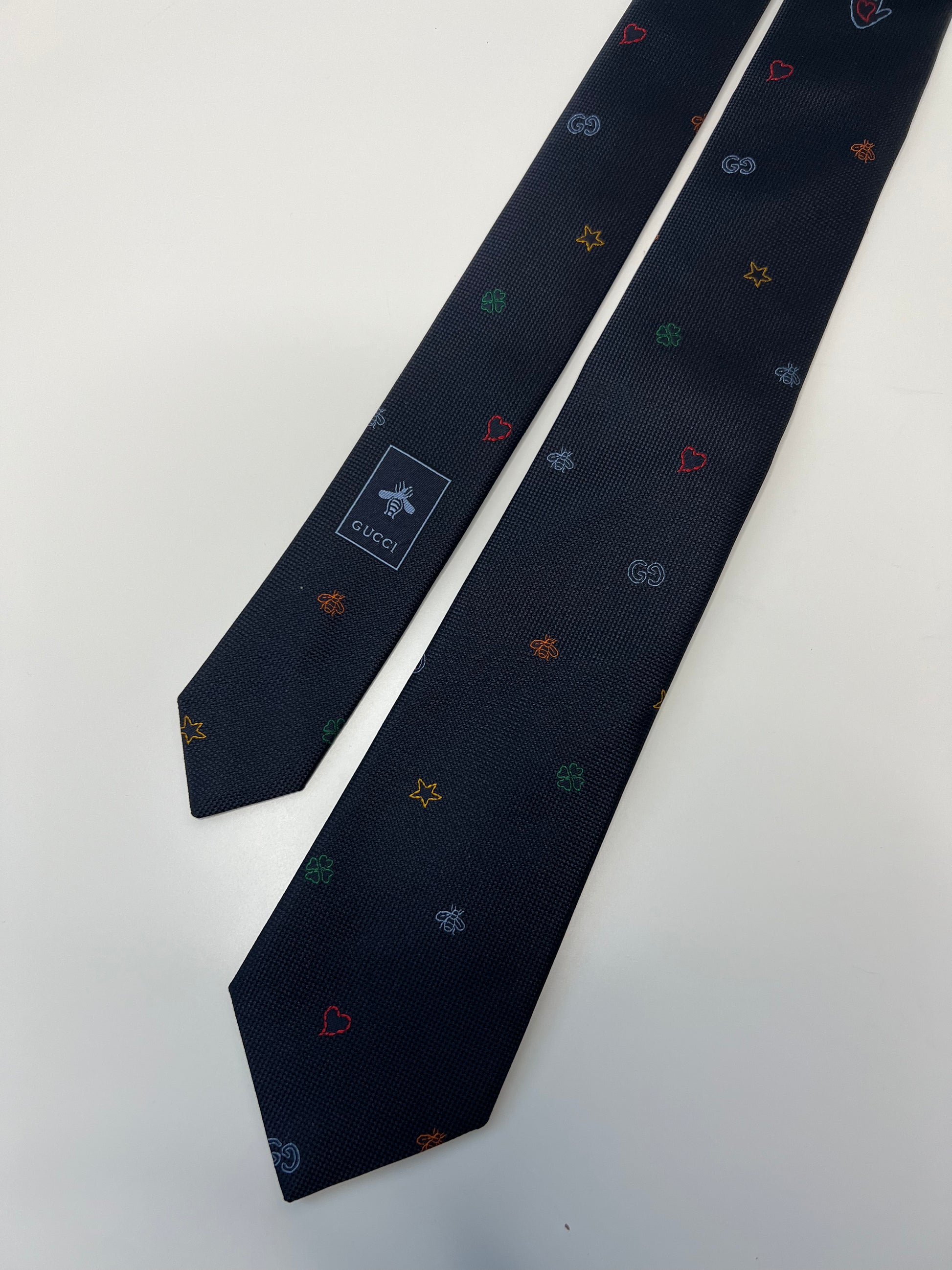 - Navy silk tie with GG, stars, clover, bees and hearts allover