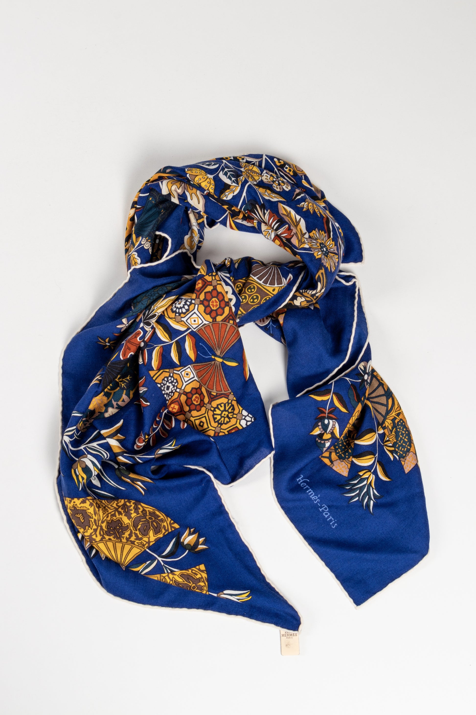 Blue, white and multicolor Hermès 140cm cashmere and silk shawl with 'Fleurs Et Papillons De Tissus' motif and hand rolled edges.