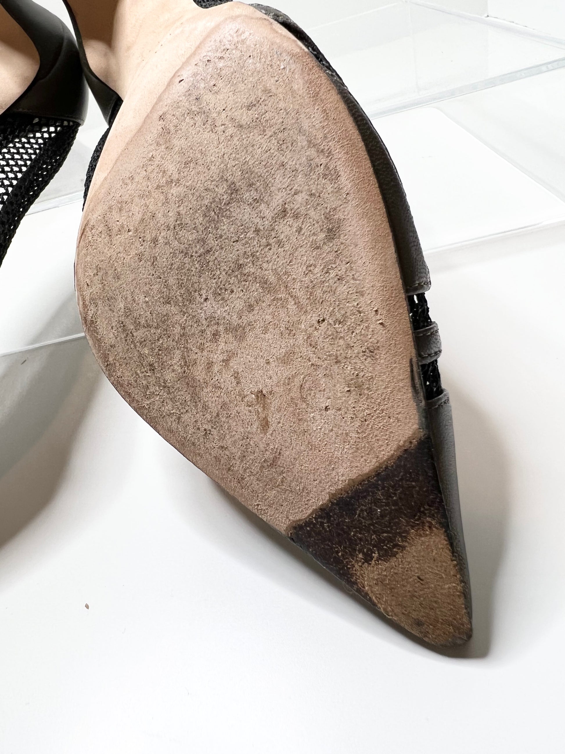 - Good condition, scuff on back of right shoe and wear on soles