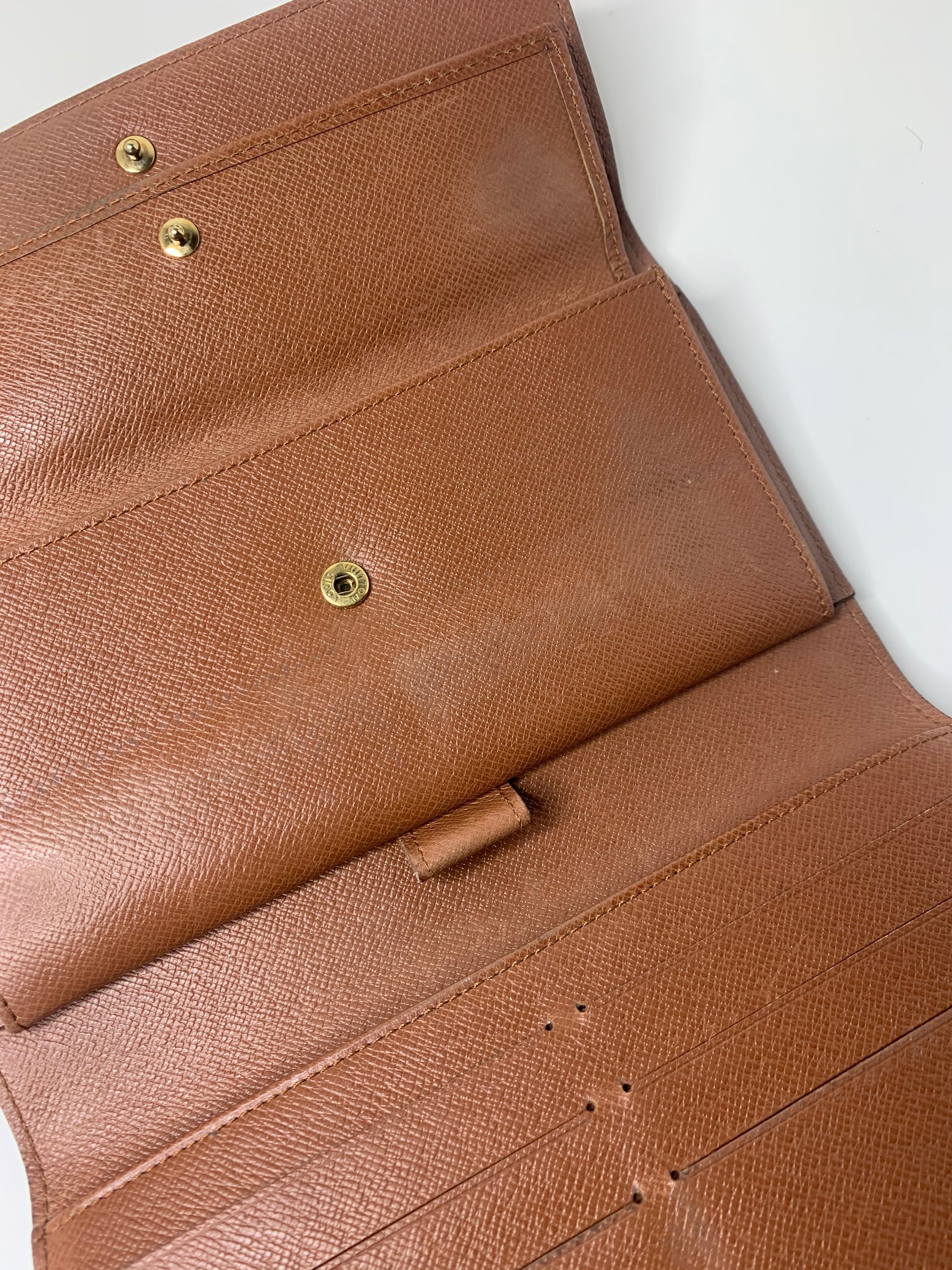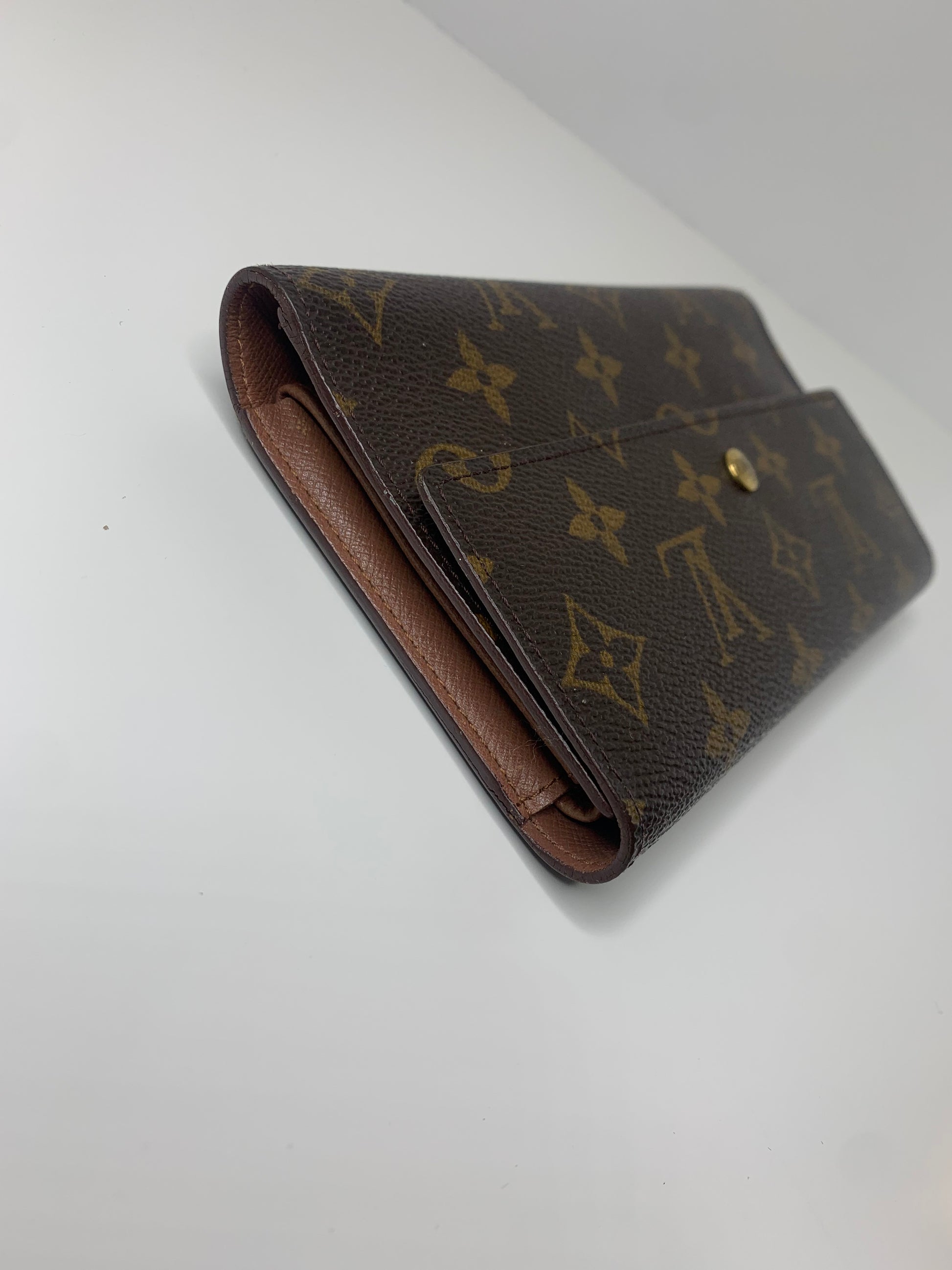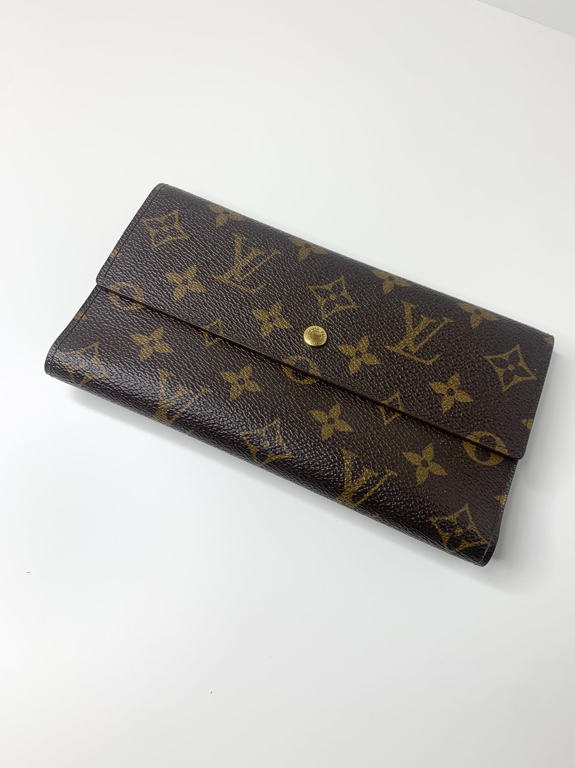 This wallet is crafted of signature Louis Vuitton monogram on toile canvas. The wallet snaps open to a brown cross-grain leather interior with card slots, bill pockets, a flap compartment, and a pen holder.