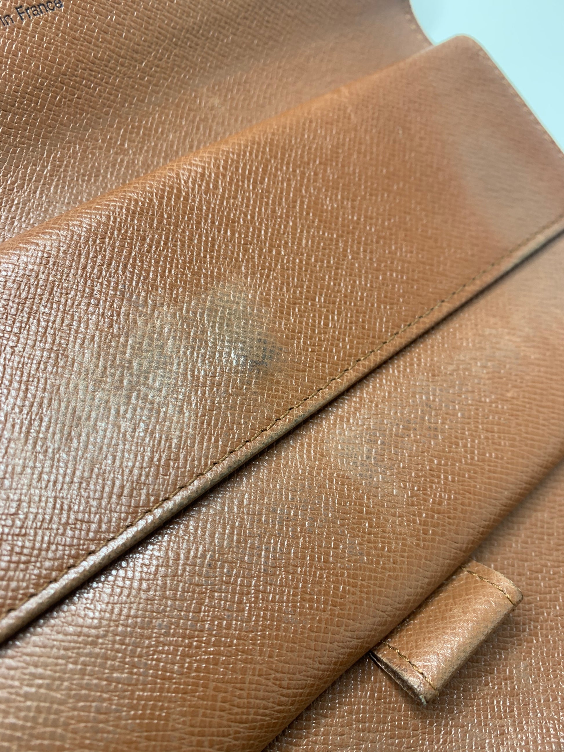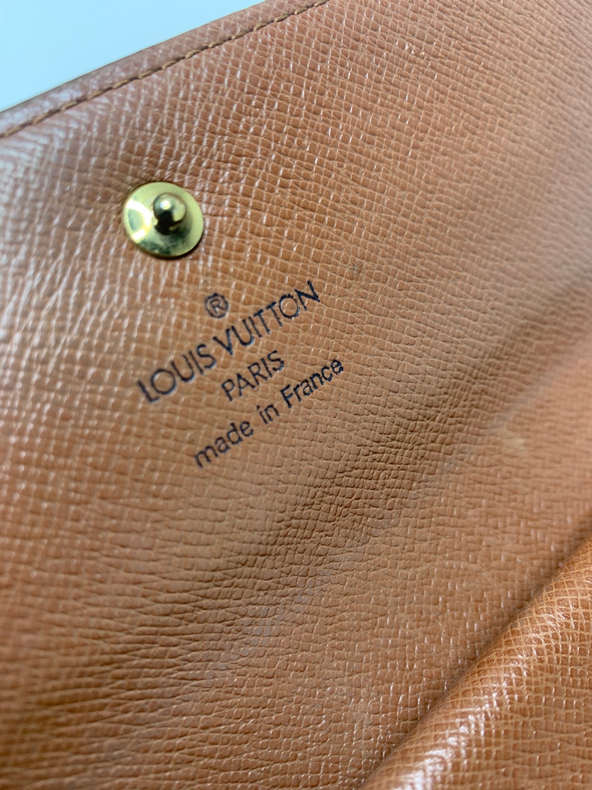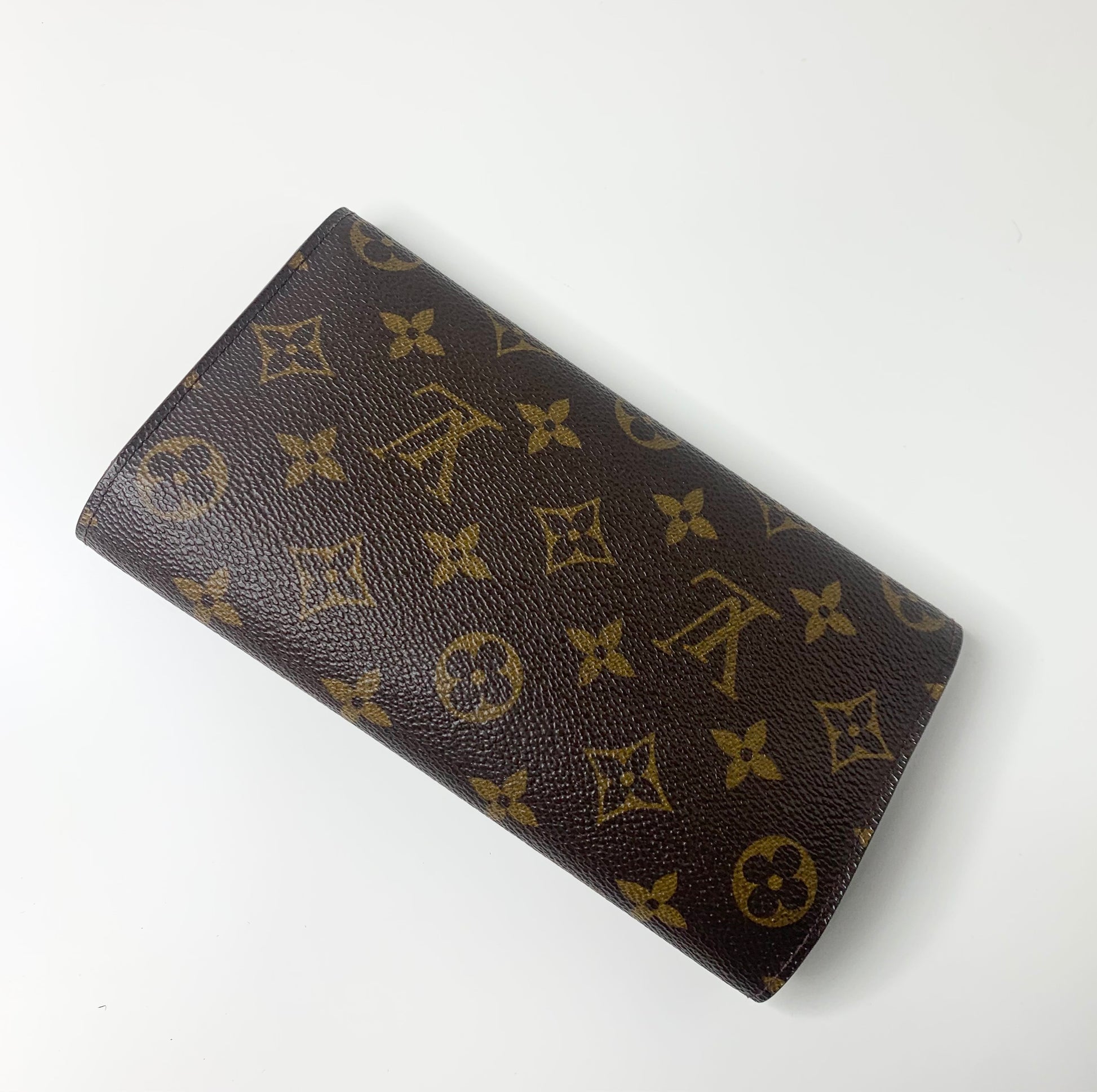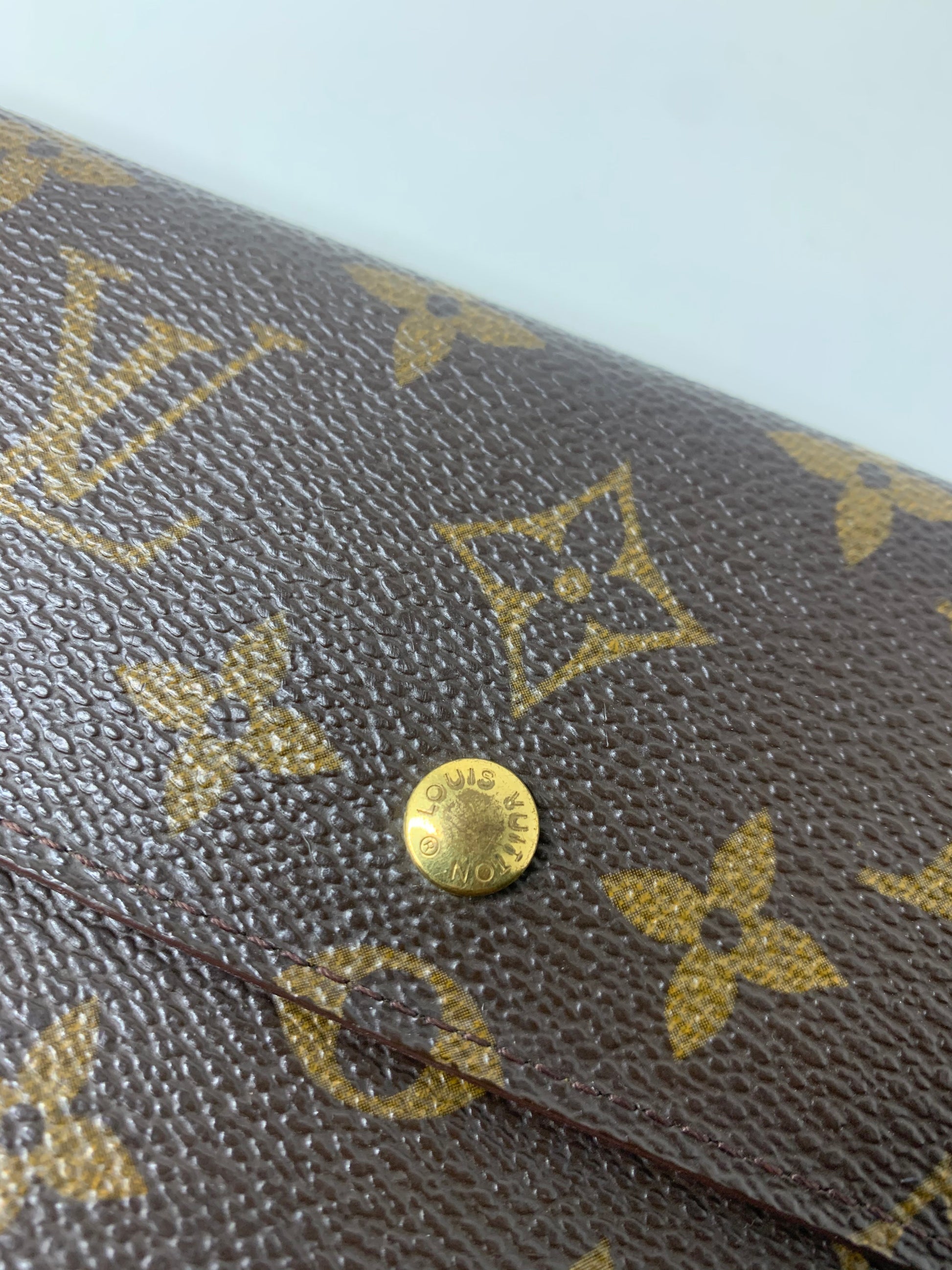 This wallet is crafted of signature Louis Vuitton monogram on toile canvas. The wallet snaps open to a brown cross-grain leather interior with card slots, bill pockets, a flap compartment, and a pen holder.