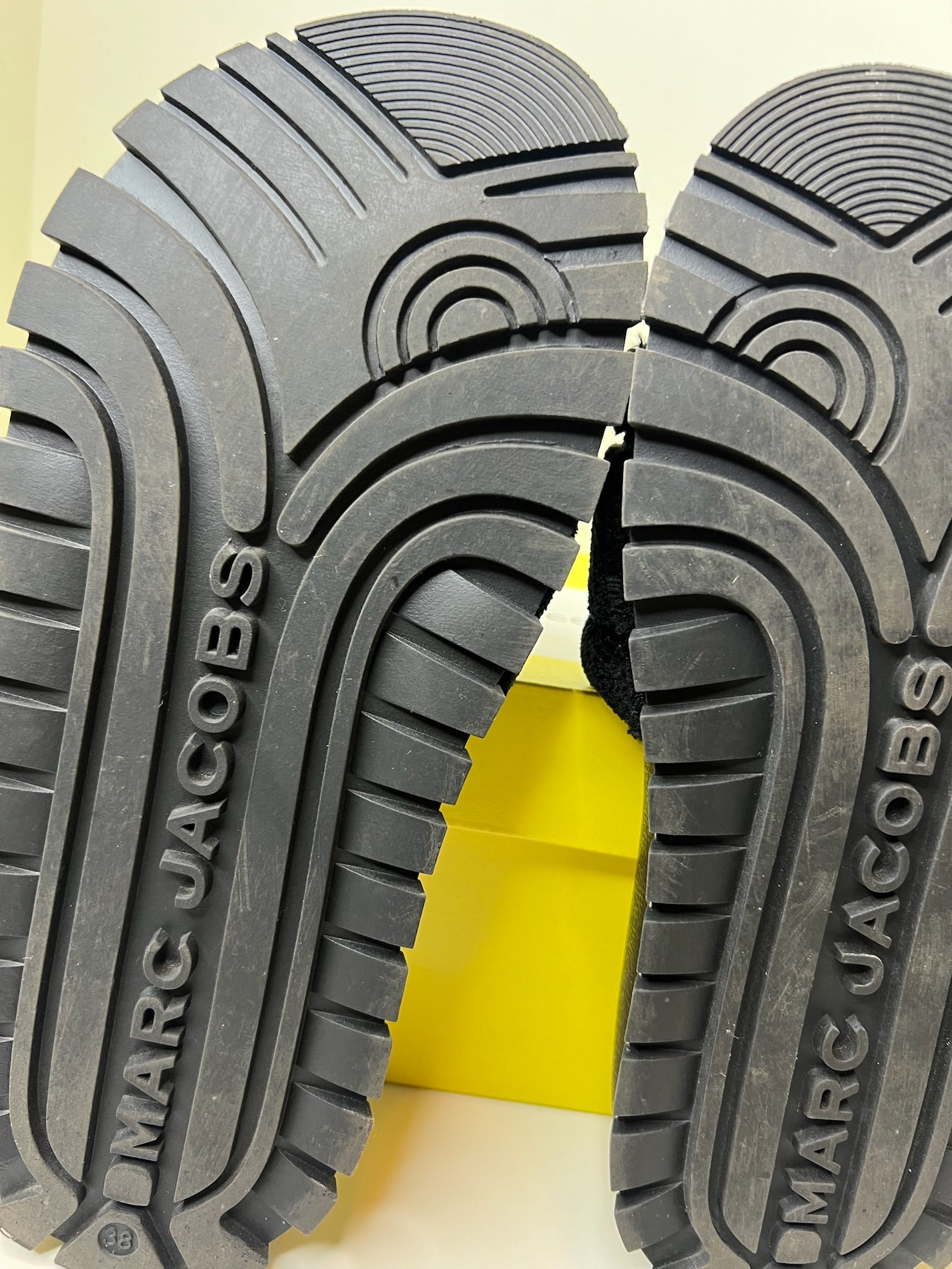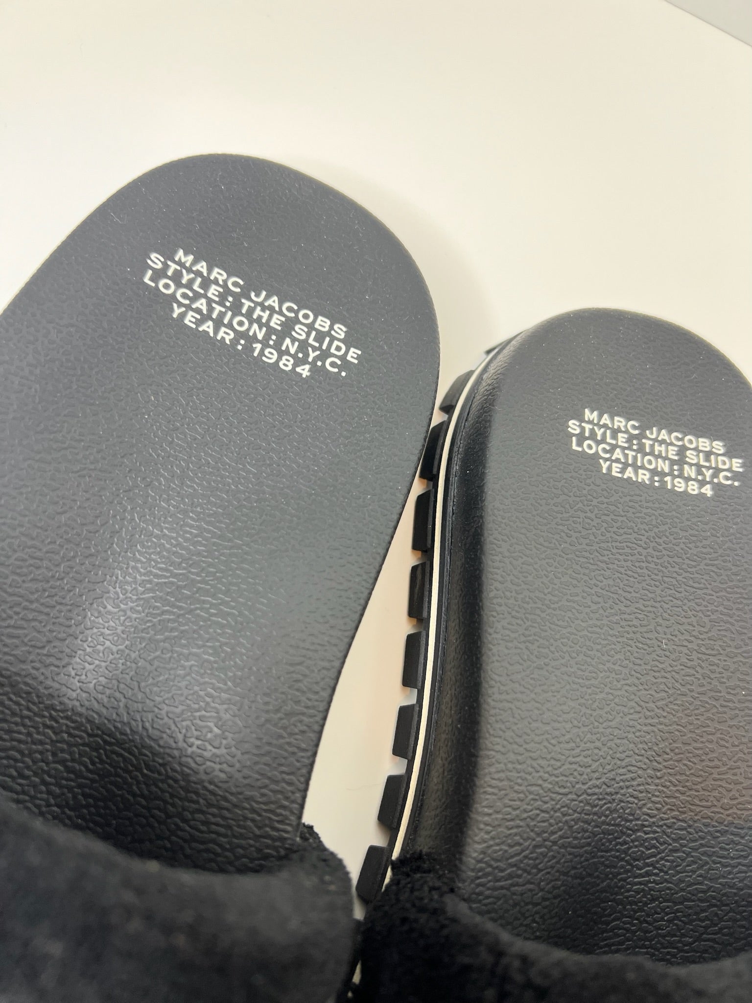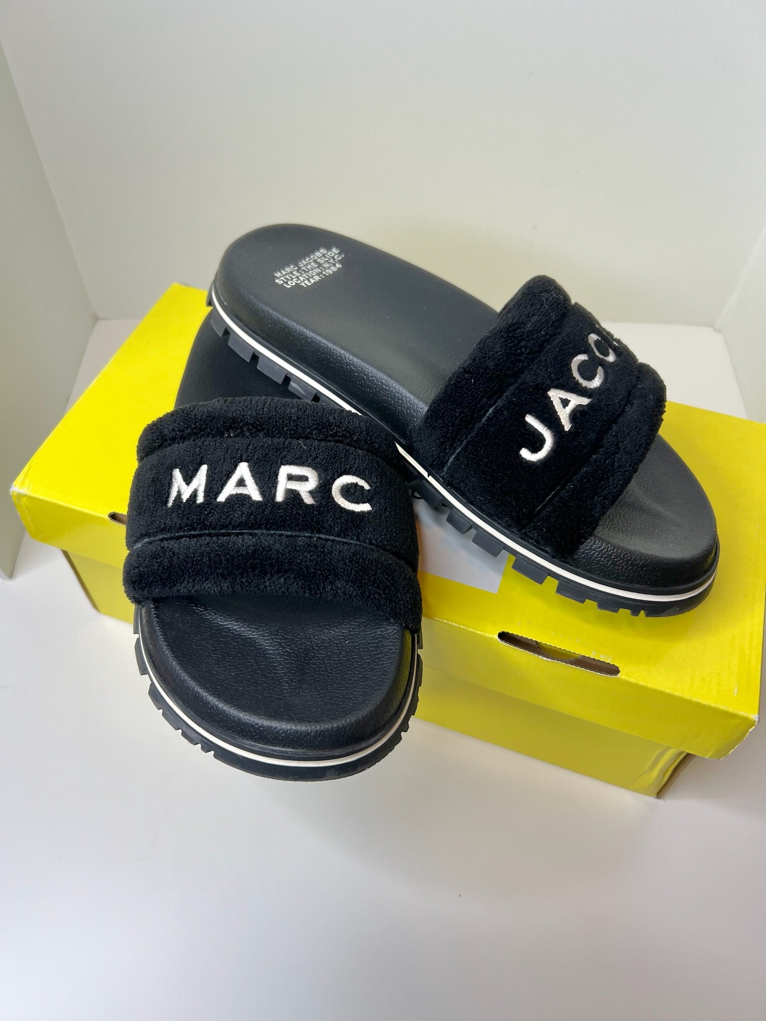 - Round toe, open toe with branded insole footbed and flat rubber sole