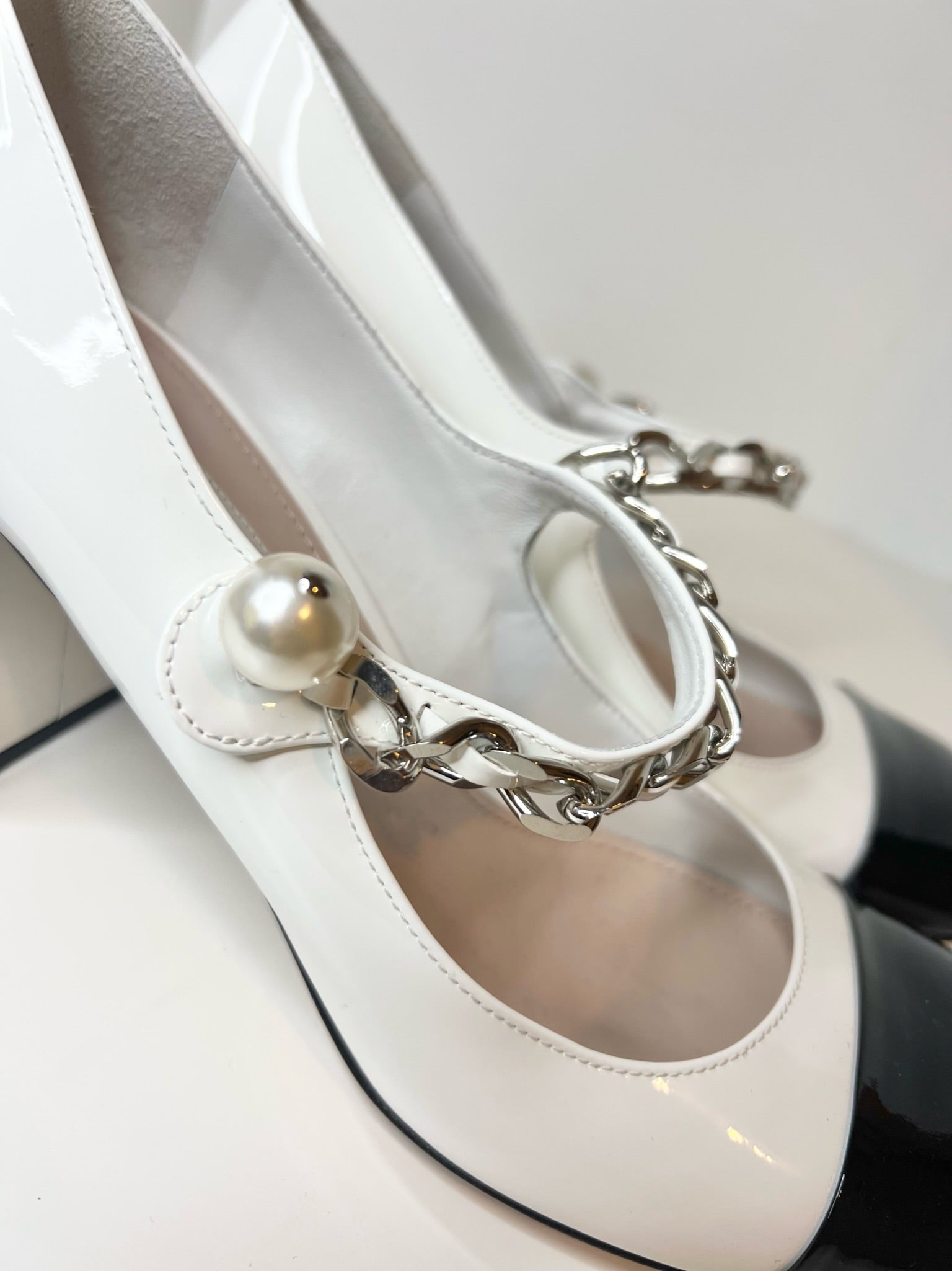 Details- Mary jane pumps in patent calf leather, black and white