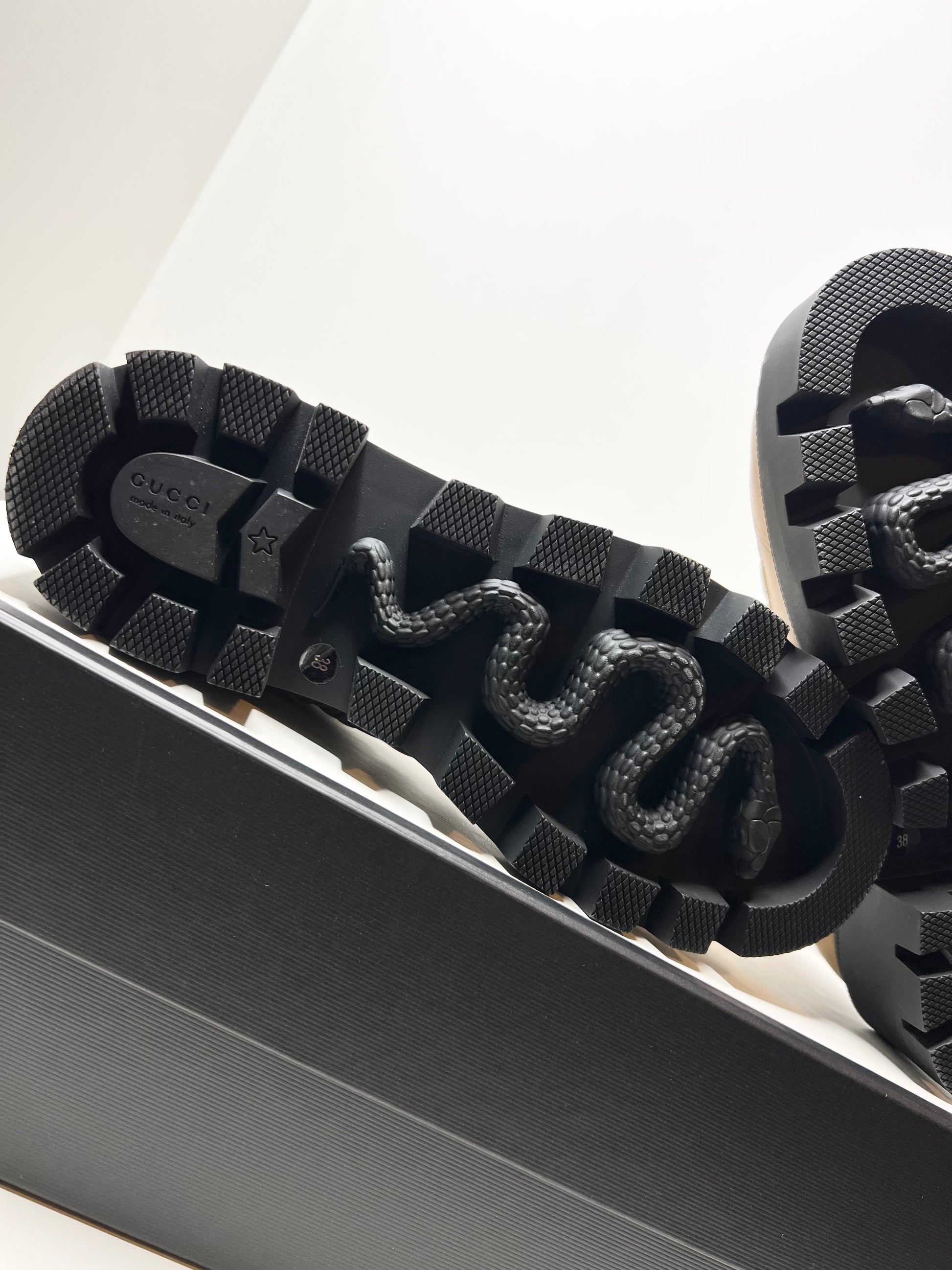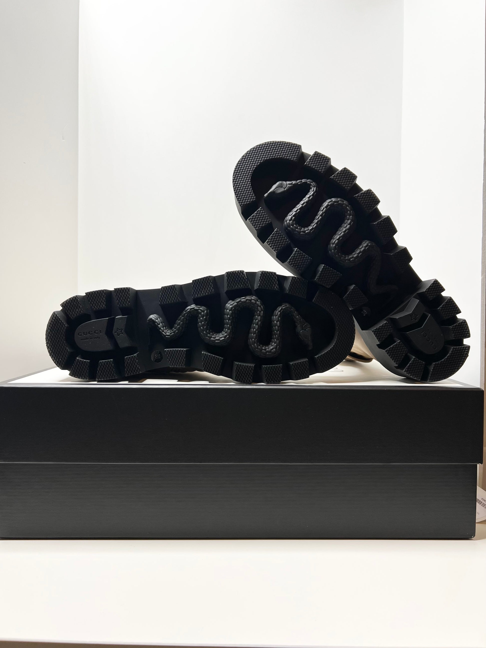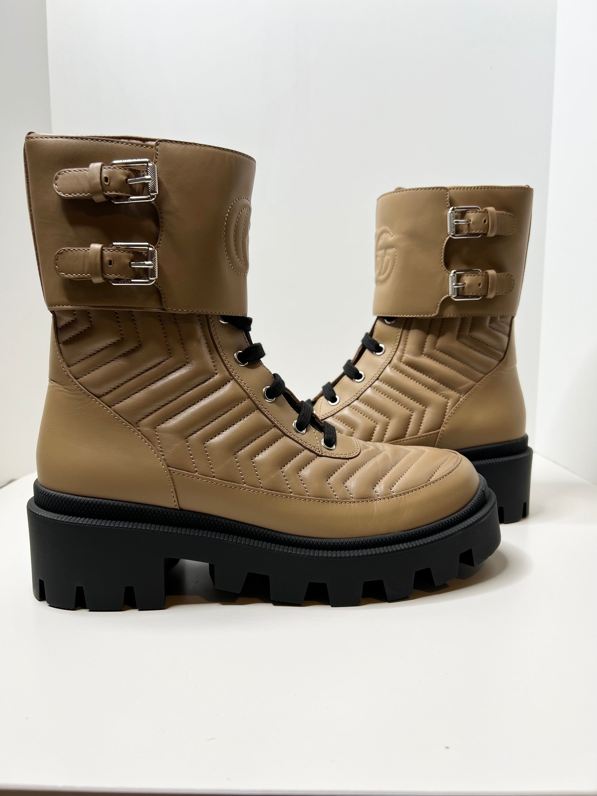 - Chevron matelassè design, lug sole, interlocking G stitched detailing, front buckle