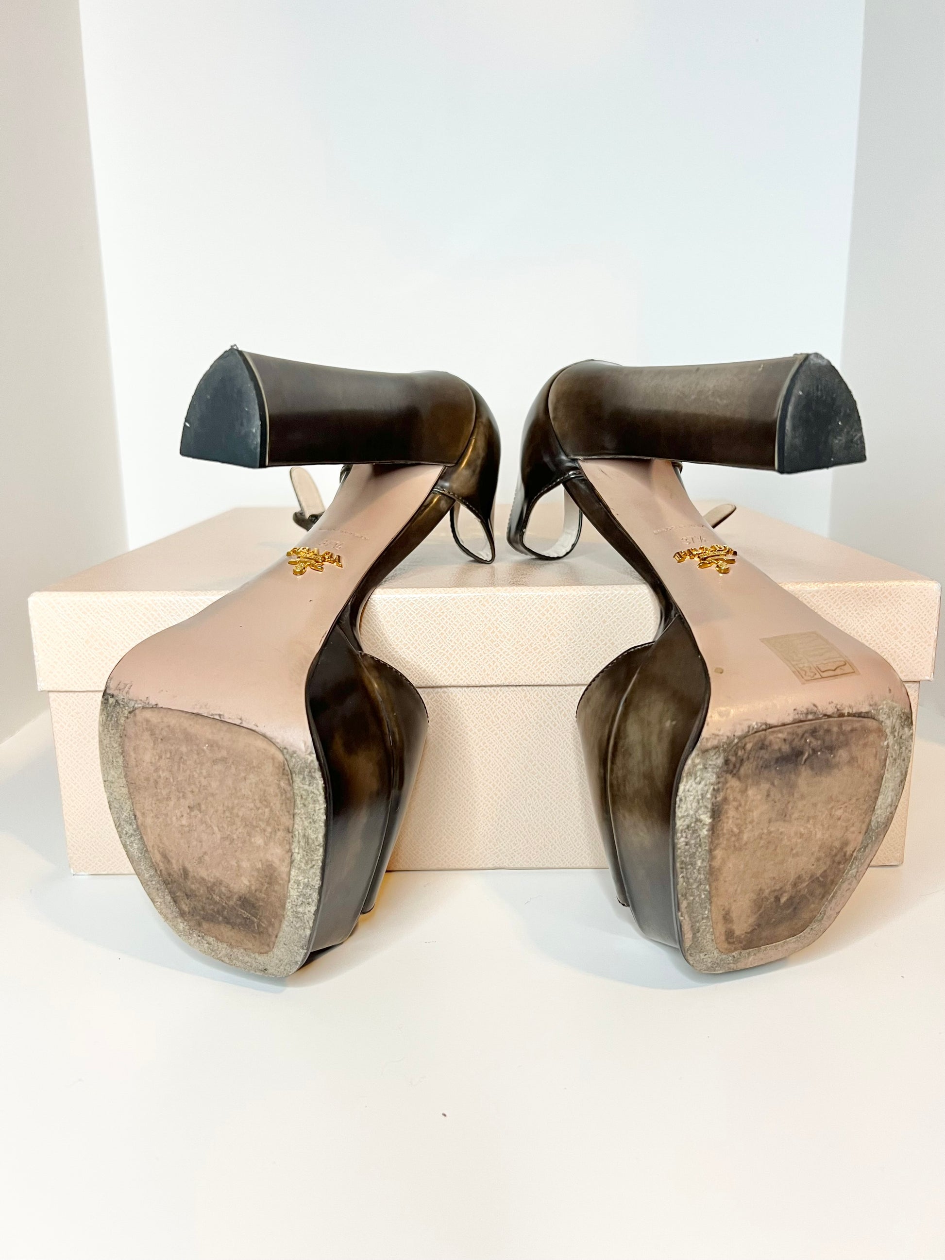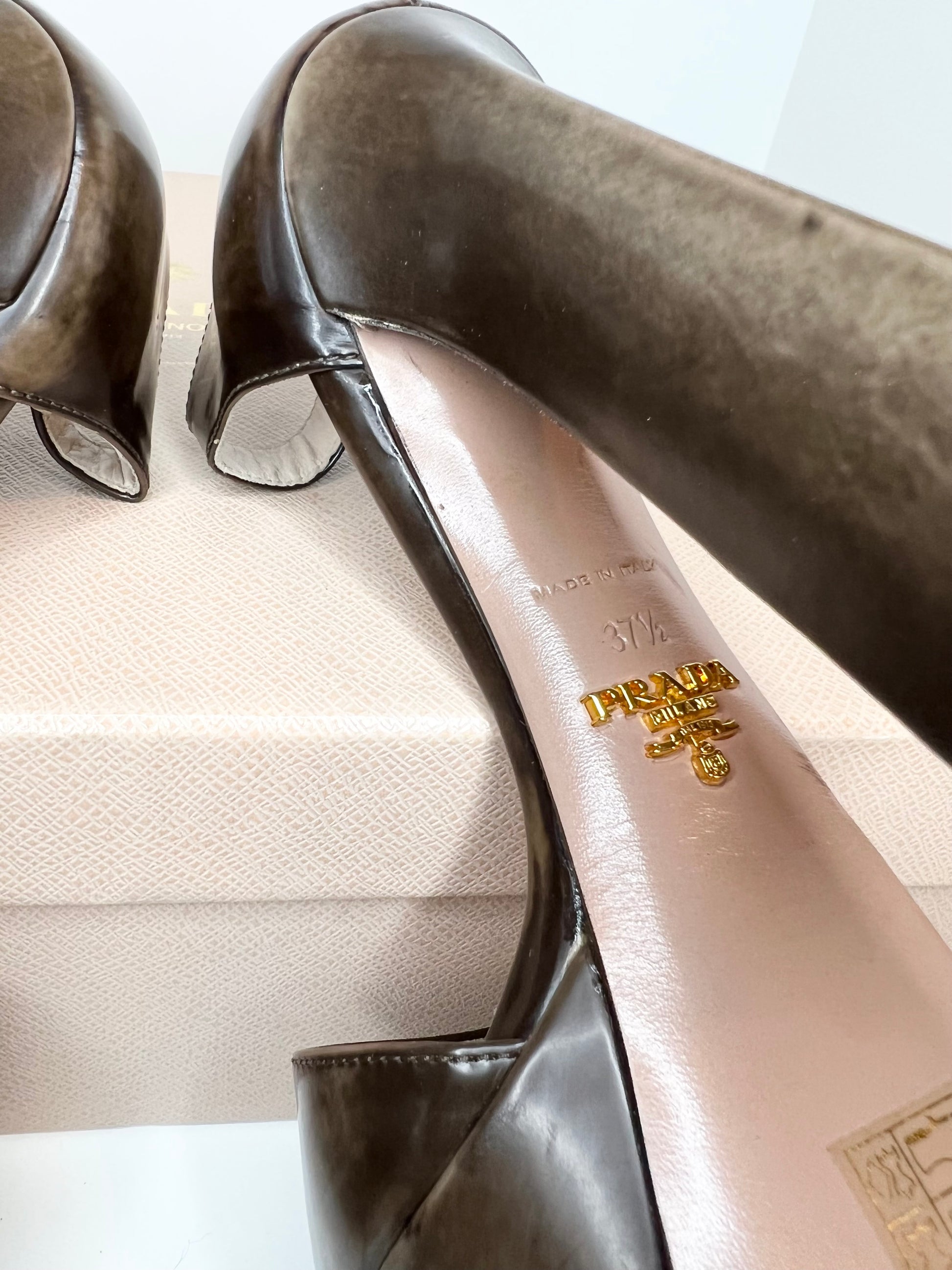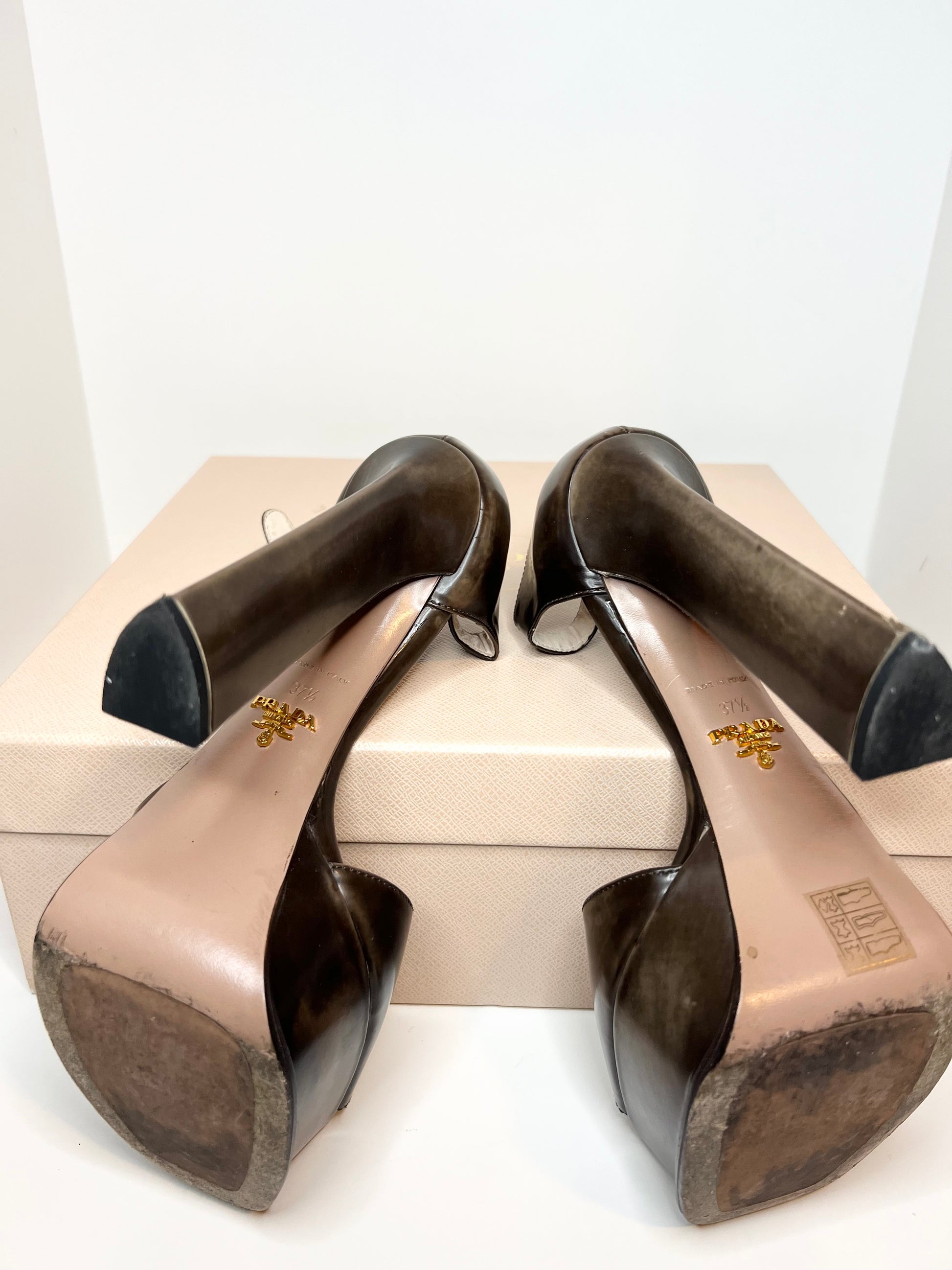 These distressed leather heels limited Update your look with these sophisticated Prada pumps. These brown patent saffiano leather brown pumps feature a gold metal heel.