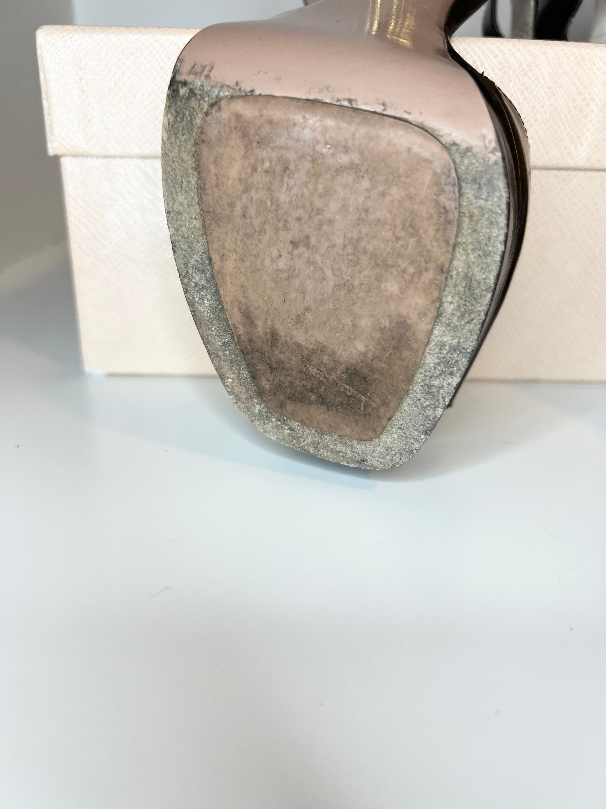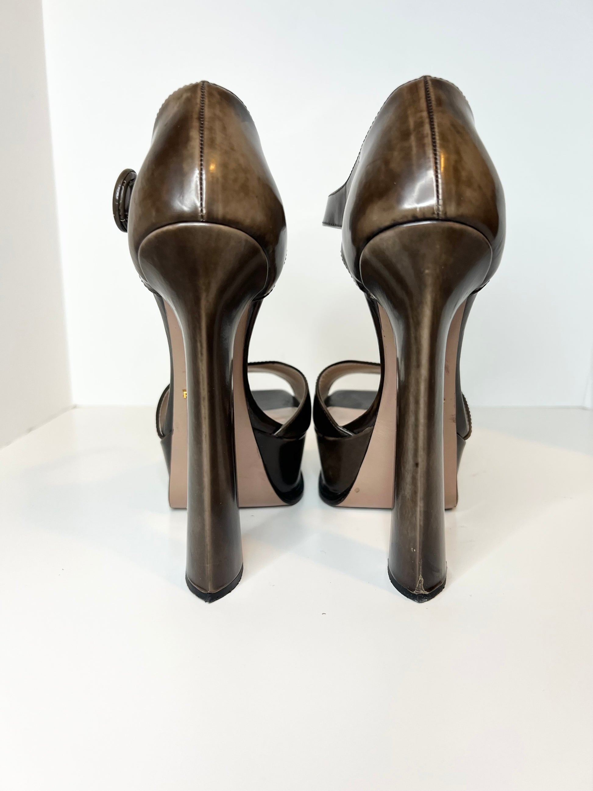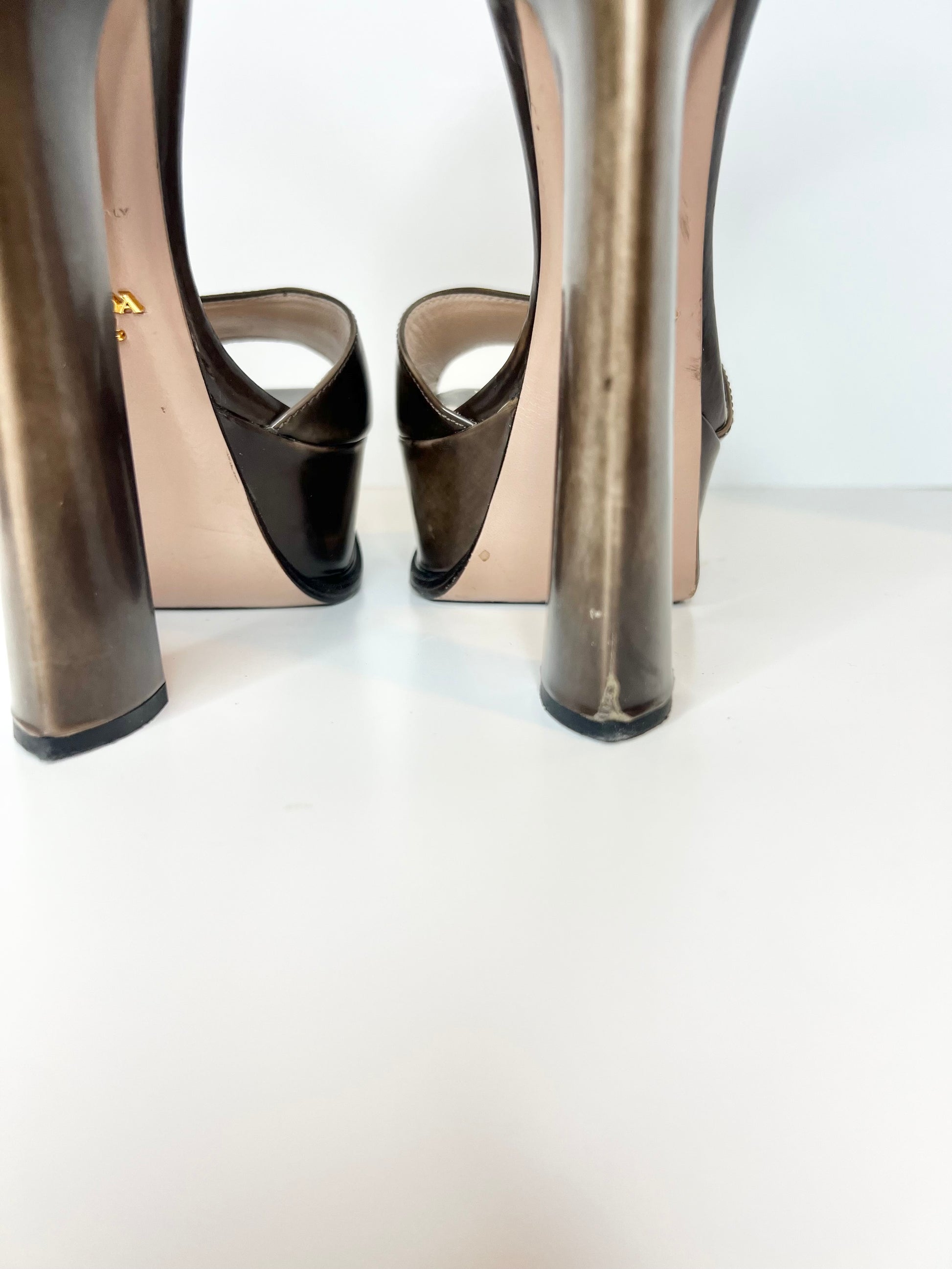 These distressed leather heels limited Update your look with these sophisticated Prada pumps. These brown patent saffiano leather brown pumps feature a gold metal heel.