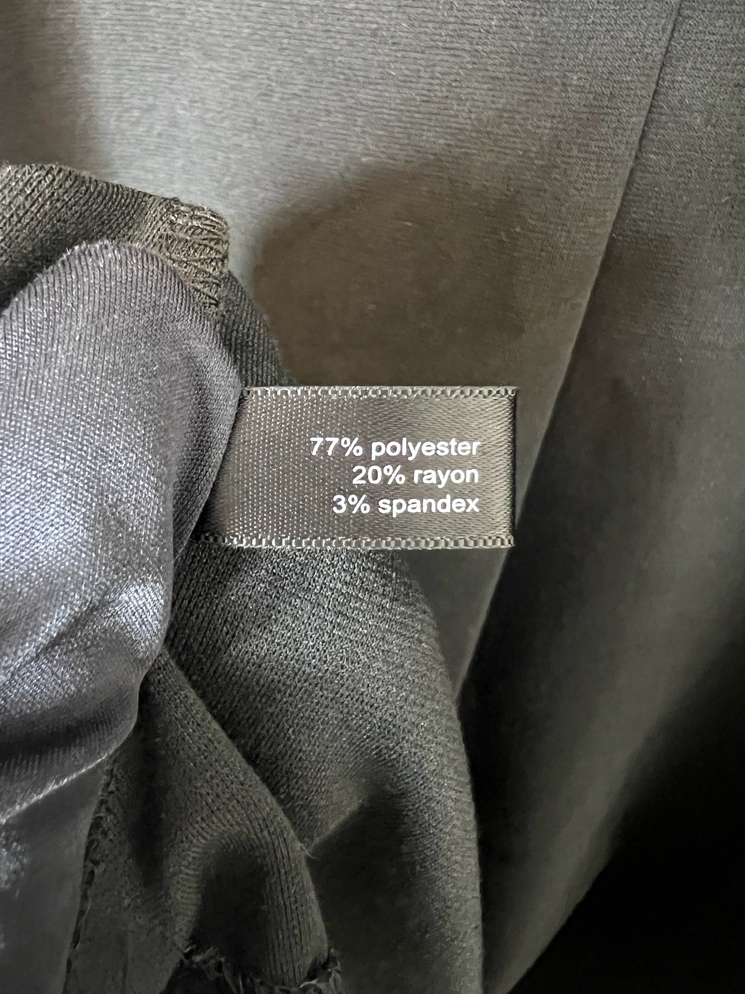 - Fabric: 77% Polyester, 20% Rayon, 3% Spandex