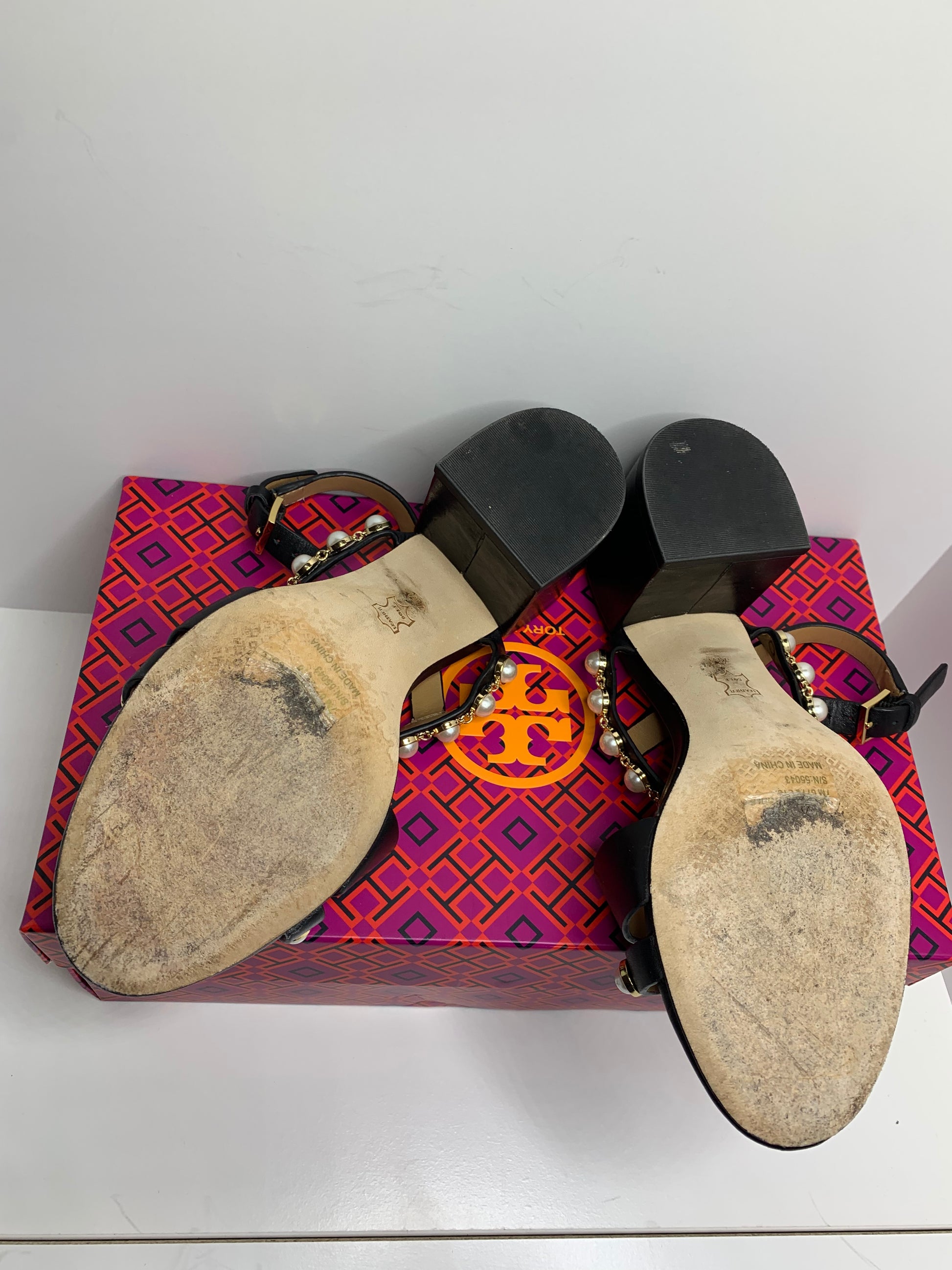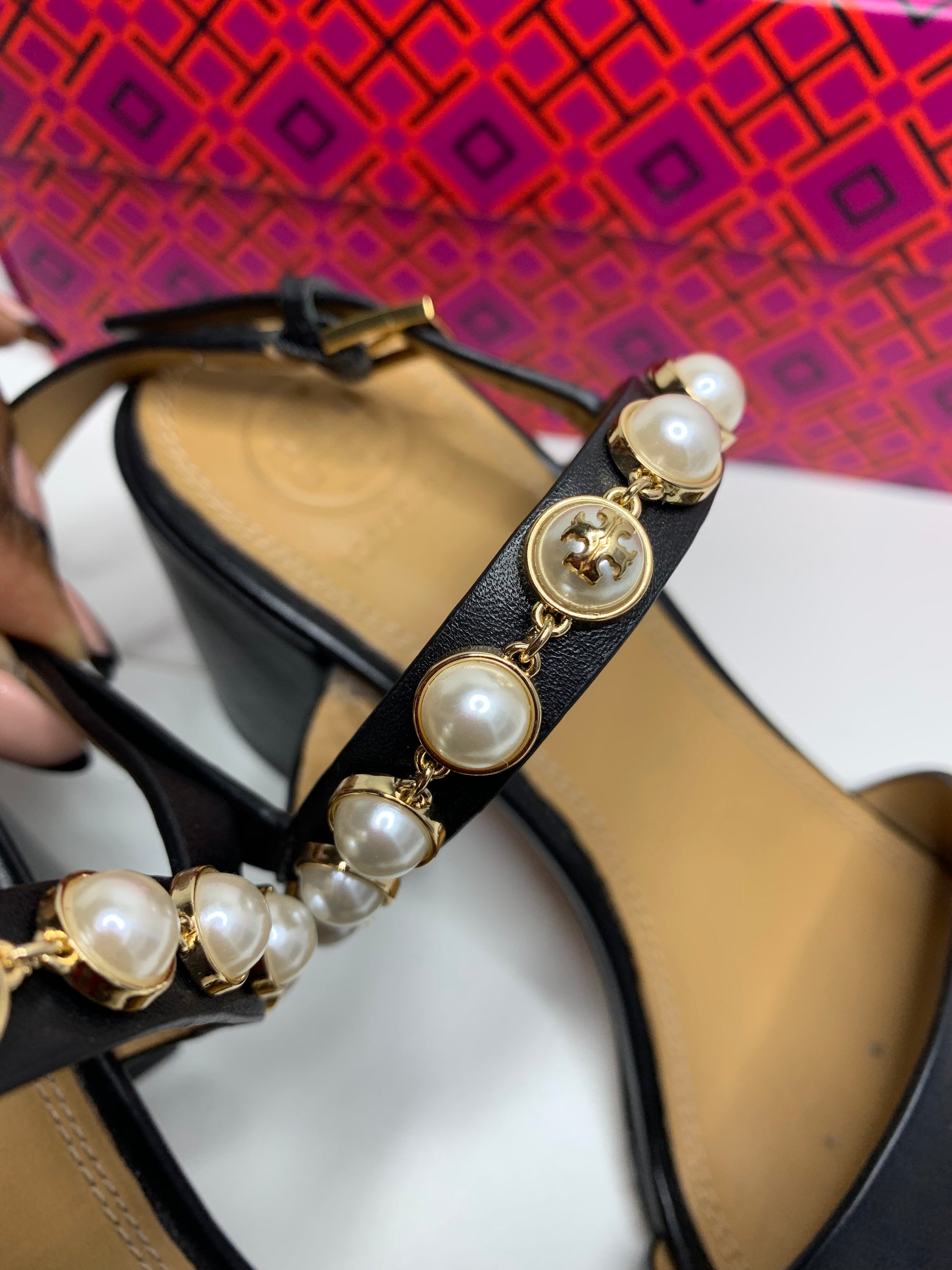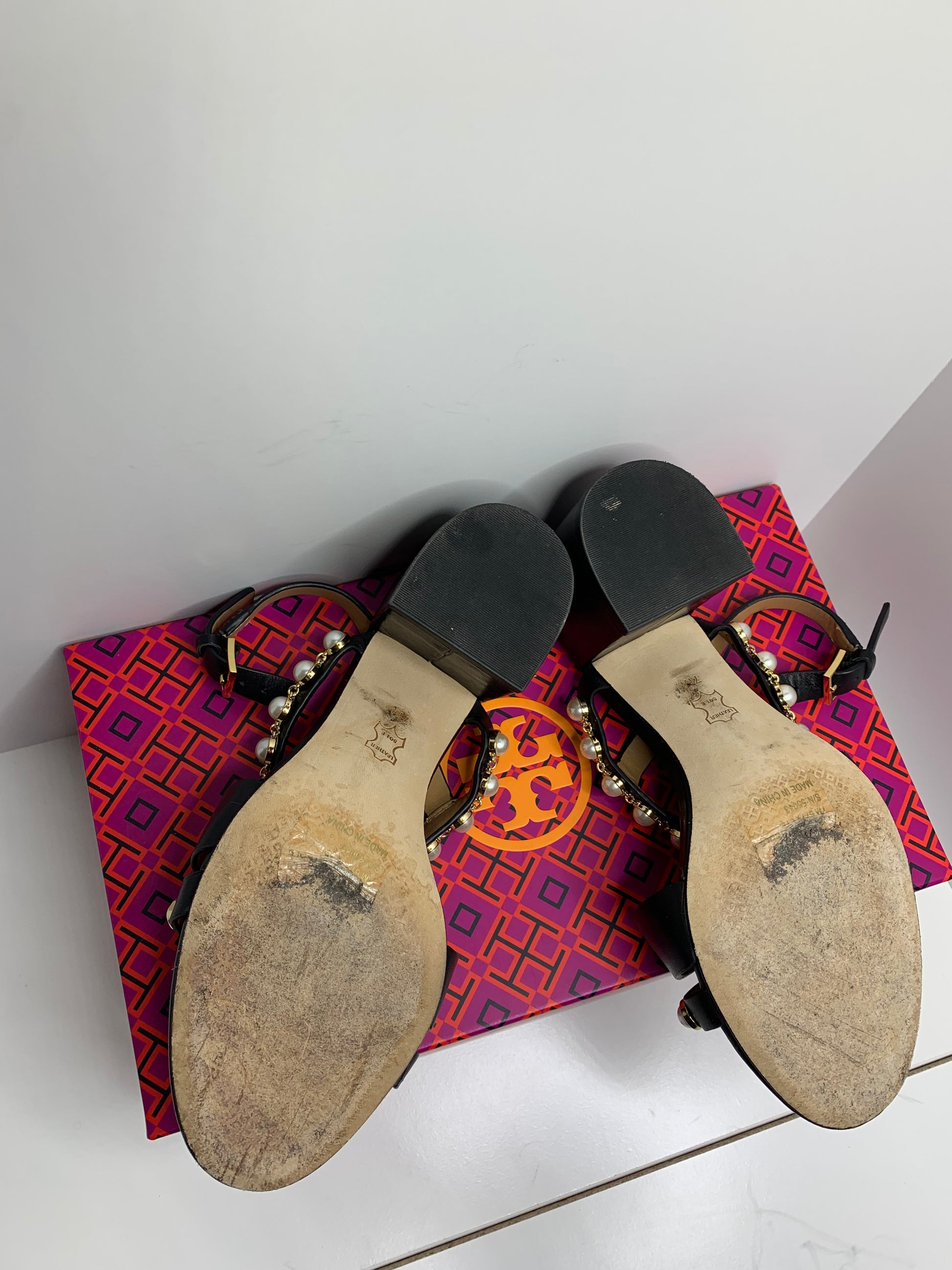 Dressed up with jewels. The Emmy Mid-Heel Sandal is easy for every day and glamorous enough for events, in leather dotted with pearl studs.
