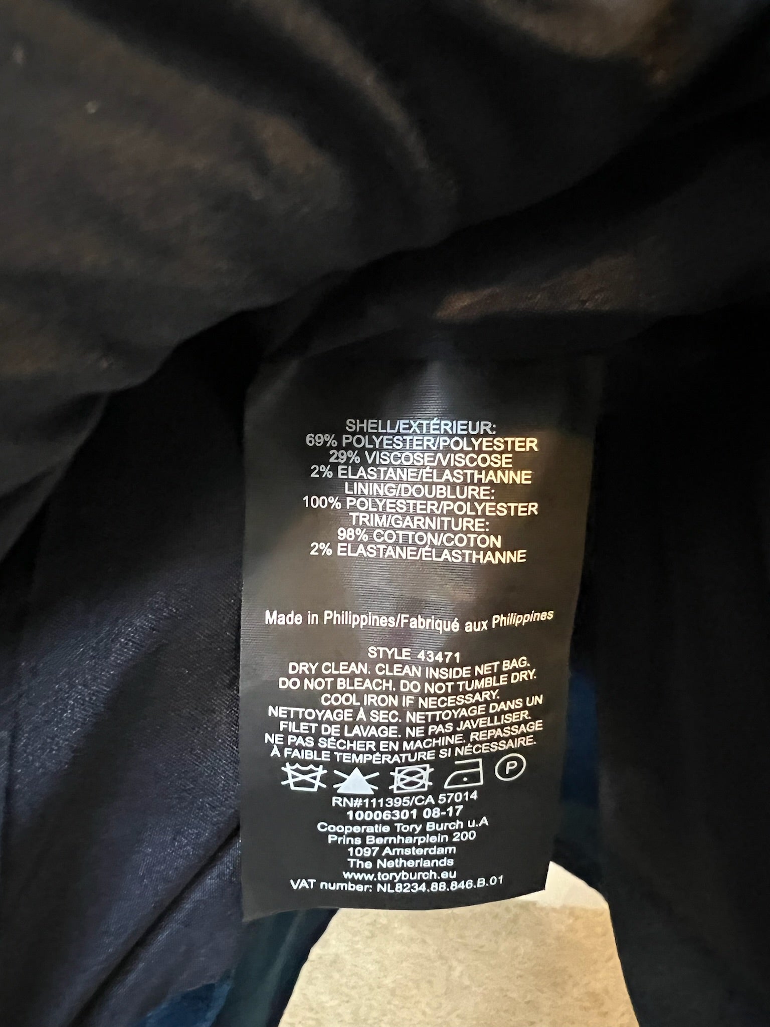 - Fabric: 69% Polyester, 29% Viscose, 2% Elastane; Trim: 98% Cotton, 2% Elastane; Lining: 100% Polyester