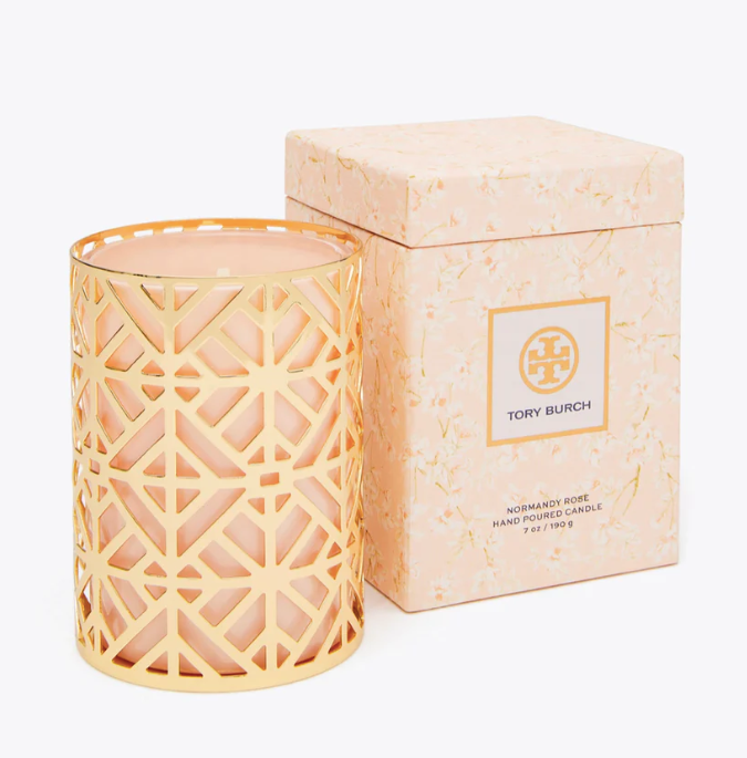 This designer candle is a rare find. Made from hand-poured soy-wax blend with a fresh floral scent, the Normandy Rose Candle is encased in glass with brass fretwork.